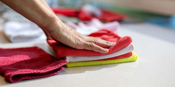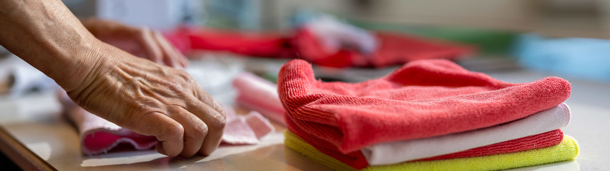 Die bunt gewobenen Stoffe aus der Beschäftigungsstätte werden hier zu schönen Handtüchern verarbeitet.